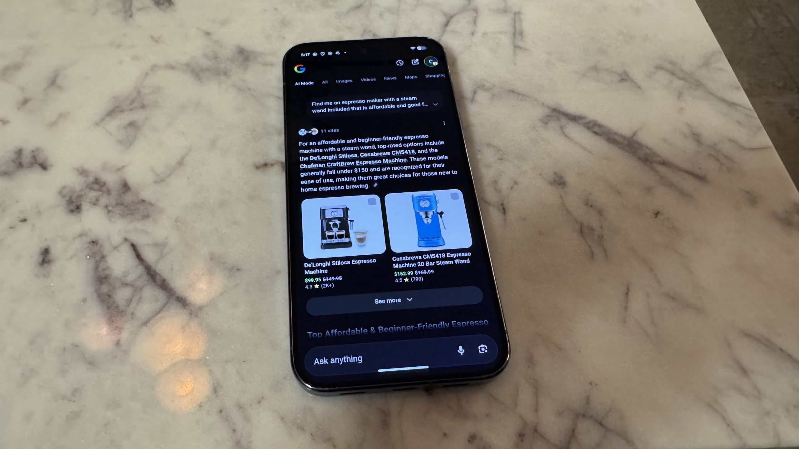Here’s how it works: In Google search’s AI Mode or the Gemini app/website, you can ask a question or send a prompt about a physical product, like “Help me find an espresso maker that has a steam wand, is affordable, and is good for beginners.” If the AI can find relevant product information in the Shopping Graph, it’ll then give you a short writeup and pop up a few product suggestions along with shopping information, like pricing and user reviews. Clicking on any of these tiles will then open a sidebar with sites where you can purchase the item.